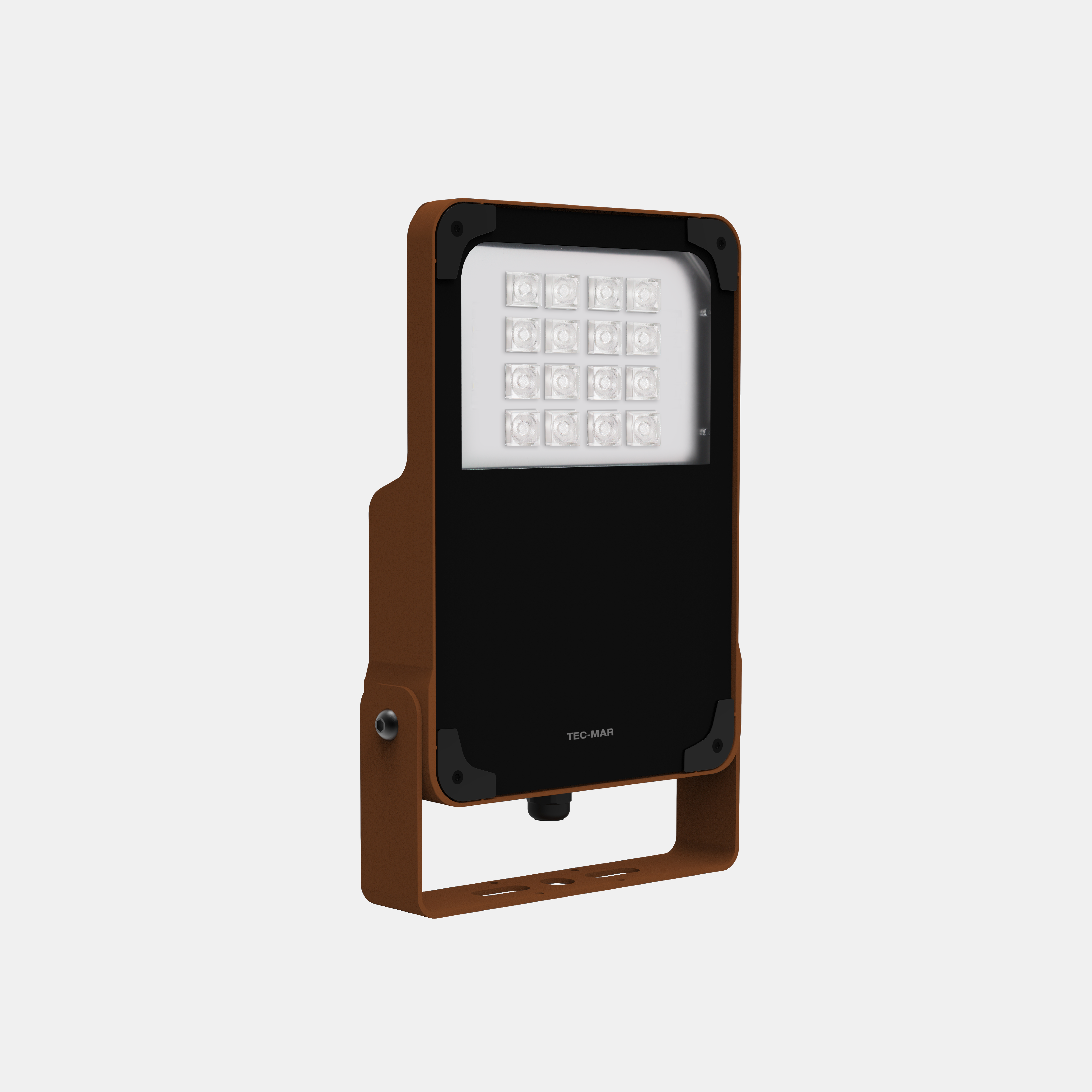 Proiettore led per interni ed esterni RGBW. Adatto per installazioni a terra, parete, su palo o a plafone. Corpo in alluminio pressofuso verniciato con polvere termoindurente poliestere anticorrosione colore corten. Diffusore in vetro piano temperato extrachiaro spessore 4 mm, guarnizione in silicone. Ottica concentrante 30°.