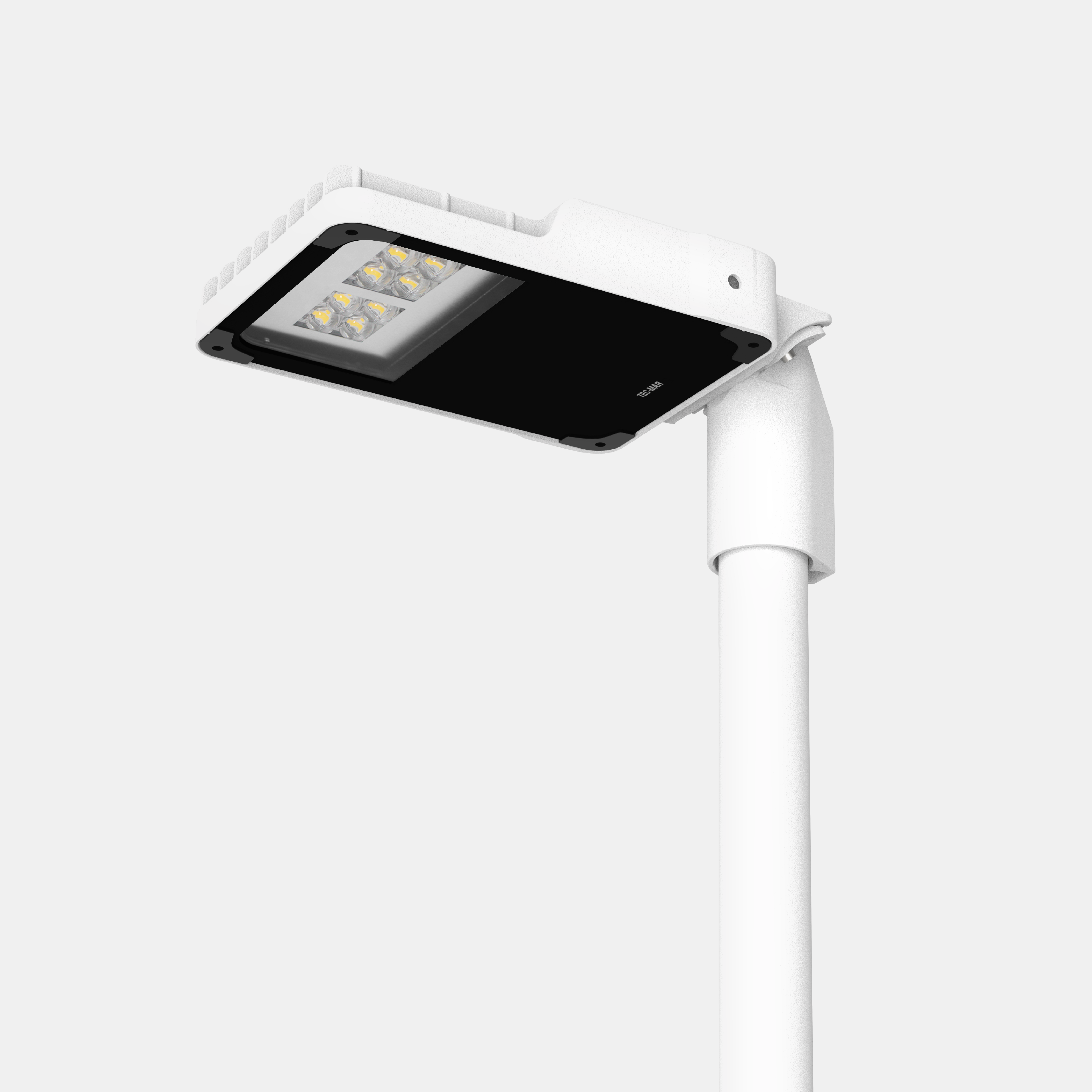 Apparecchio led per l’illuminazione di strade urbane, extra-urbane, percorsi pedonali, adatto per installazione su testa palo, braccio orizzontale, mezzo palo (singolo o doppio) o a parete. Corpo in alluminio pressofuso verniciato a polvere termoindurente poliestere anticorrosione colore bianco, dissipatore in alluminio pressofuso con struttura ad alette e diffusore in vetro piano temperato extrachiaro spessore 4 mm. Attacco palo in pressofusione d’alluminio, compatibile con pali di ø 60-75 mm, con regolazione 0°/+90° su testa palo e -20°/+ 20° su sbraccio orizzontale. Ottica asimmetrica ciclopedonale EN13201 classe P (tipo II/III).